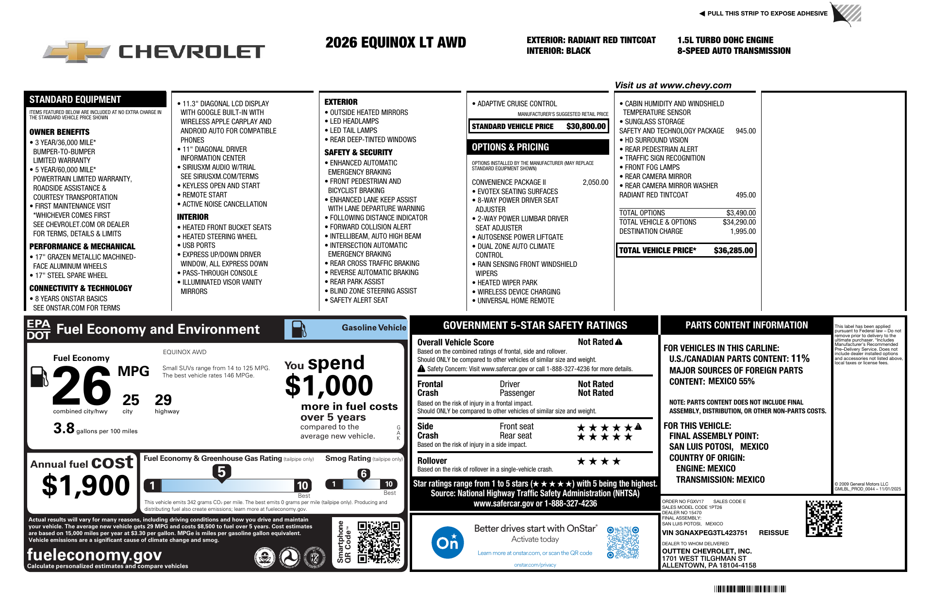 Stand out in striking Red with a sleek Black interior — the 2026 Chevrolet Equinox LT blends style, comfort and confidence. It comes standard with AWD, stability and traction control, a full suite of airbags and ABS for peace of mind, plus run‑flat tires and a limited‑slip differential for surefooted handling. Enjoy modern convenience with keyless entry, remote ignition with climate control, navigation, heated front seats and a heated steering wheel, and an upgraded power sunroof to brighten every drive. Backed by Chevrolet’s 3‑year/36,000‑mile basic and 5‑year/60,000‑mile powertrain warranties (plus 6‑year/100,000‑mile rust coverage), it’s a smart, ready‑to‑go compact SUV — come take it for a test drive today.