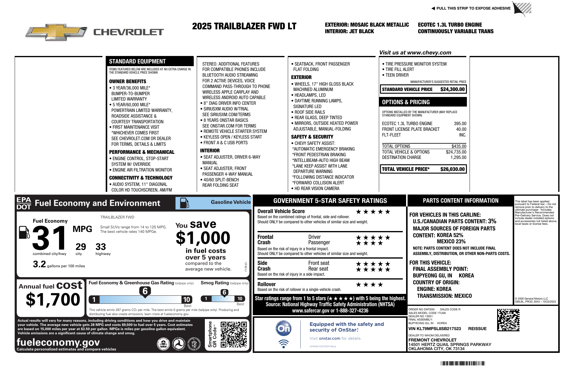Meet the 2025 Chevrolet Trail Blazer FWD LT — a sleek black-on-black crossover that blends bold style with everyday practicality. This Trail Blazer comes loaded with driver-friendly tech and comfort: keyless entry and remote start with climate control, navigation and AM/FM audio, steering-wheel controls, heated front seats and a power sunroof for open-air drives. Safety and confidence come standard — multiple airbags, ABS, traction control, vehicle stability control, child safety locks and a vehicle anti-theft system. Ride smart with alloy wheels, automatic headlights, daytime running lights and a well-proportioned cabin that comfortably seats five. Backed by Chevrolet warranties (3/36 basic, 5/60 powertrain, 6/100 rust), this Trail Blazer LT is ready for your next adventure. Ready to see it in person? Call or stop by today for a test drive.